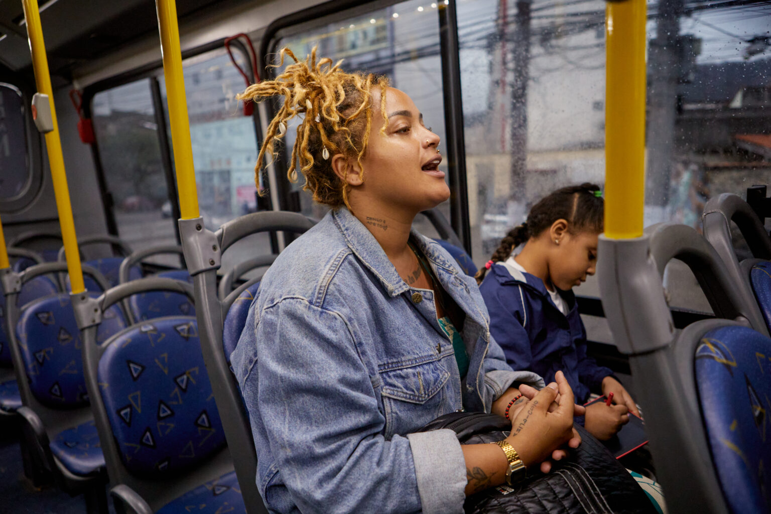 No banco do ônibus, organizo lanche, seguro mochila, respondo perguntas, até mesmo é onde acontece o lanche que não deu tempo de acontecer em casa. Na condução lotada, meu braço é escudo contra empurrões, minha voz precisa inventar calma, e pedir assento quando está muito difícil.