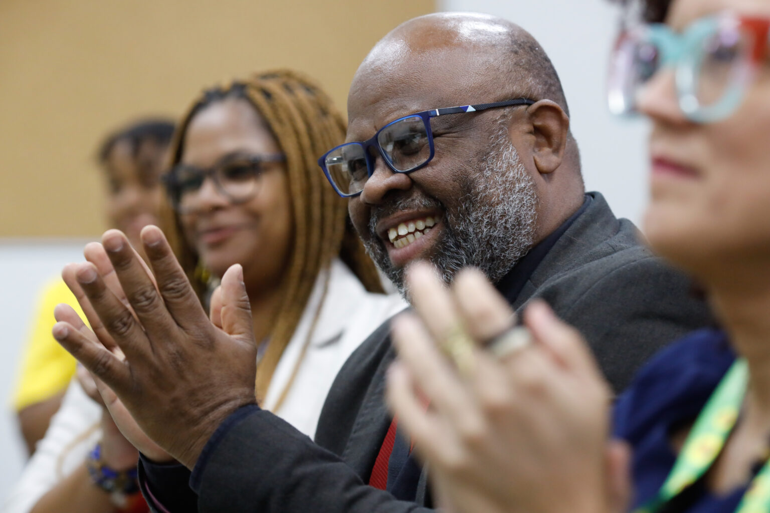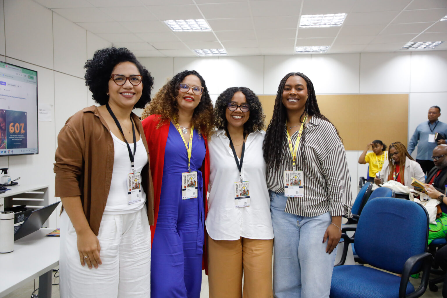 Paola mediou a mesa “Como as organizações negras chegam na COP”, reunindo Lídia Lins, do Ibura Mais Cultura; Taynara Gomes, do CBJC; e Luanda Ferraz, da Rede por Adaptação Antirracista, para discutir o financiamento climático a partir da filantropia, refletindo sobre como esse movimento pode fortalecer organizações negras que já atuam com o clima nas bases e nos territórios, especialmente em periferias e favelas.